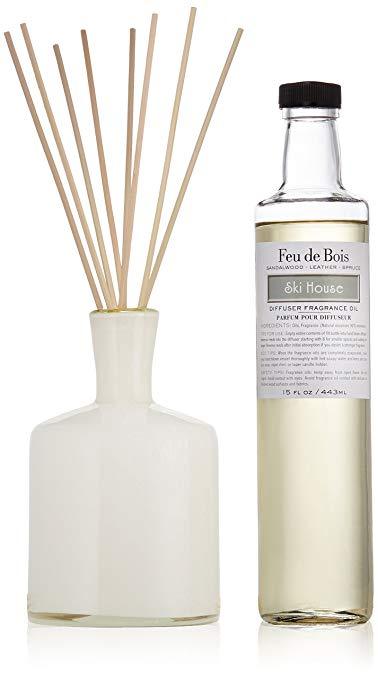 - Crafted with premium quality fragrances and delivered in a beautiful handblown art glass vessel with hand-cut reeds, our Feu de Bois, Ski House diffusers fill your home with luxurious fragrance. 15 oz. unique hand blown vessel compliments any home décor and provides constant elegant fragrance for up to 1 year.