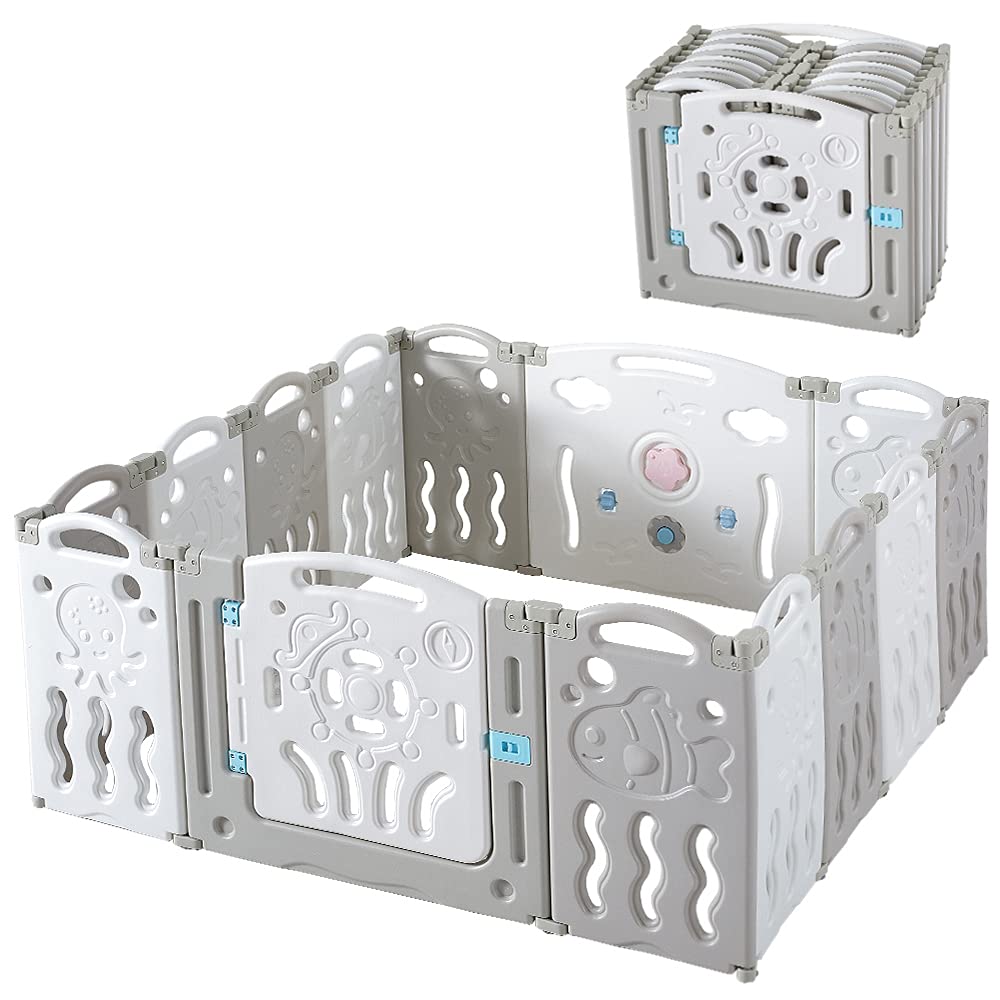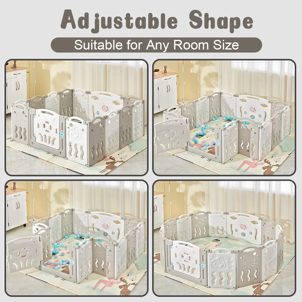 Baby Playpen 14 Panels Folding Kids Safety Play Center Yard, Game Panel and Gate with Safety Lock, Adjustable Shape for Children Toddlers Indoors or Outdoors(Grey+White, 14 Panel) 14 Count (Pack of 1) Grey