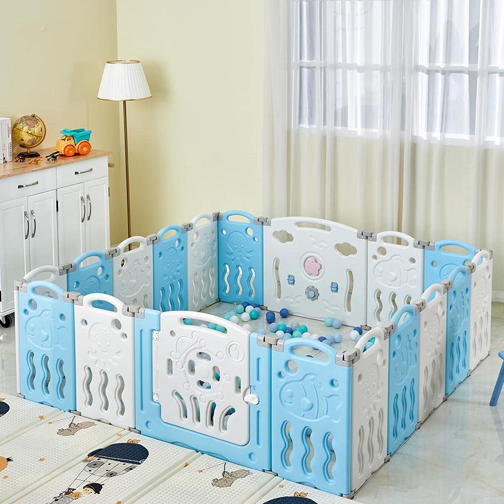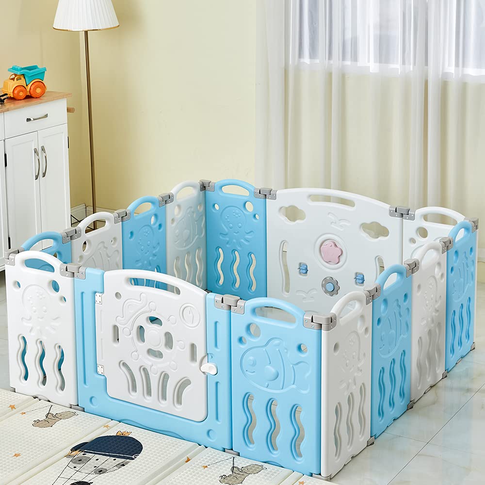 HDPE Waterproof Safety Material - Our baby fence is made of premium HDPE materials, BPA free and ASTM certisfied, so that it will not harm your baby's health. 14 Panels Enough for 1-2 children to play in the safety activity center.