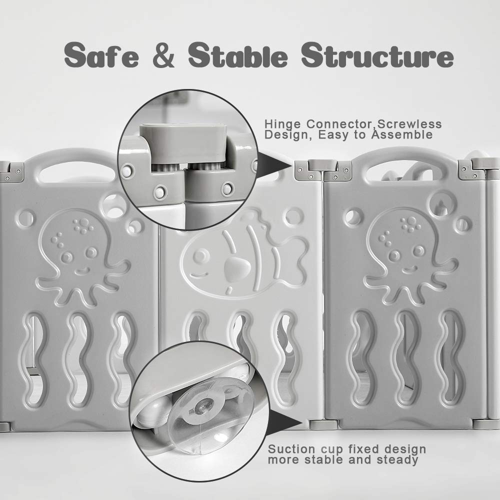 Double Anti-slip Suction Cups & Safety Lock - Each panel bottom is outfitted with double rubberized suction cups that create a sturdy base designed to withstand sliding from your mobile child and comes with external locking gate that is very secure and a great feature to walk in and out your toddler playpen.