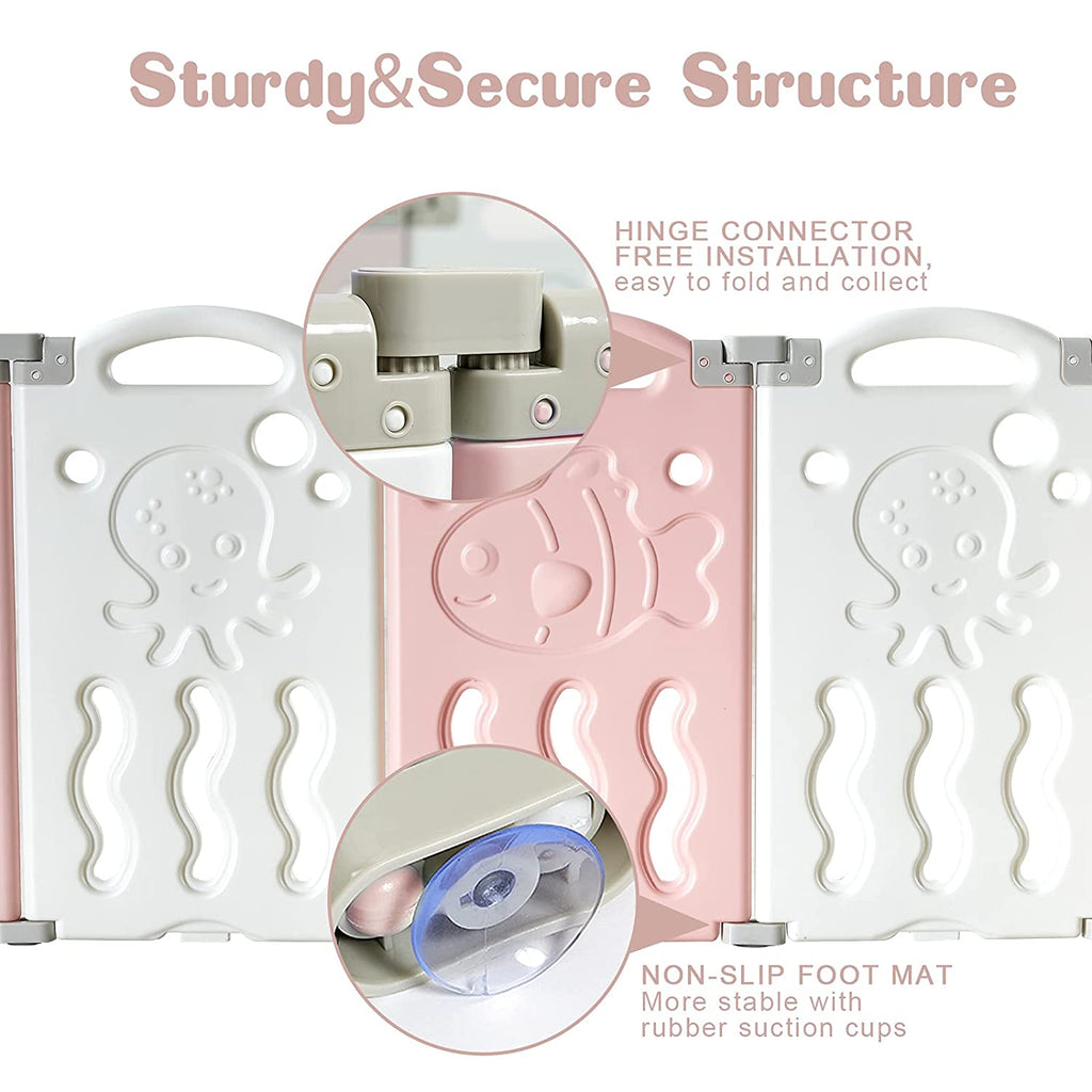 Double Anti-slip Suction Cups & Safety Lock - Each panel bottom is outfitted with double rubberized suction cups that create a sturdy base designed to withstand sliding from your mobile child and comes with an external locking gate that is very secure and a great feature to walk in and out your toddler playpen.