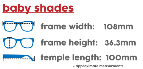 100% UVA/B&C; shatter resistant protection in all lenses.mirrored andpolarized lens upgrades available.made in Italy like your designer shades.material is specially designed with babies in mind: durable, flexible, chewable, light, and comfortable. soft and safe for little faces, hands and mouths.nearly indestructible: we offer a full damage and lens replacement guarantee. we dare you to break them.certified BPA, lead, and latex free. small parts tested as safe for babies.we mold our logos into our design to eliminate unnecessary paint.over 25% lighter than Babiator's baby shades! so light they can float!all packaging made in the USA of food grade material.prescription-ready.Purchase your prescription glasses, sunglasses, and transitions by clicking hereor take them to any optician and get your prescription filled. no need to purchase those expensive designer frames!you are helping support the autism charity Surfers Healing with every purchase.fits from 0-24 months+ depending on baby's head size. the flexible material gives lots of room to grow!
