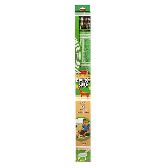 Saddle up for some playtime fun with this sturdy, colorful horse ranch rug! Durably made to look great for countless playtimes to come, the woven rug with a skid-proof backing comes with four molded plastic horses and features details like a stable, riding track, paddock, pasture, and a riding trail to give many options for creative play. Large format is big enough for multiple kids and lots of horses.