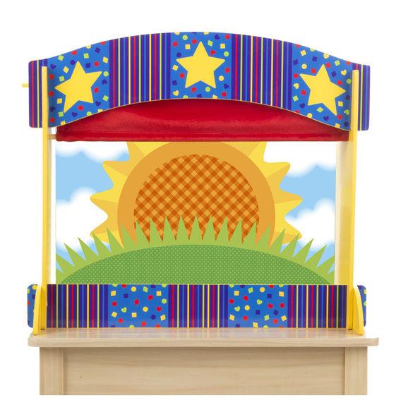 This tabletop puppet theater lets a child's imagination take center stage. Roll up the velvet curtain to start the show. Roll it closed after the grand finale. Flip the reversible backdrop for an enchanted kingdom or a brilliant sunrise. Assembles in seconds for instant show time.