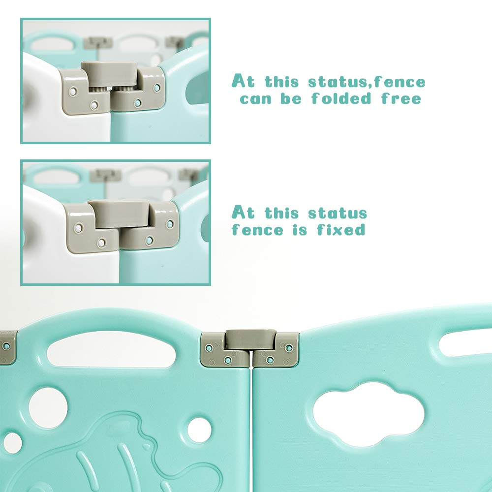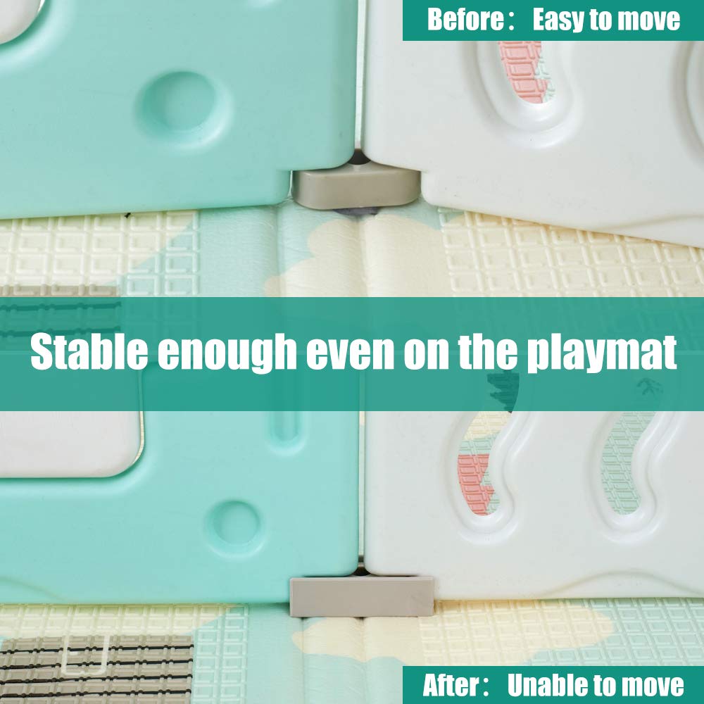 Double Anti-slip Suction Cups & Safety Lock & Extra Suction Cups Fix Device - Each panel bottom is outfitted with double rubberized suction cups that create a sturdy base designed to withstand sliding from your mobile child and comes with an external locking gate that is very secure and a great feature to walk in and out your toddler playpen. We add extra suction cups to fix devices to keep the whole playpen more stable.