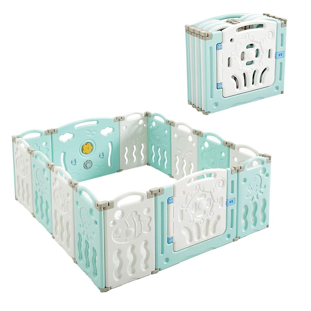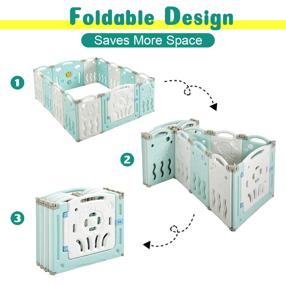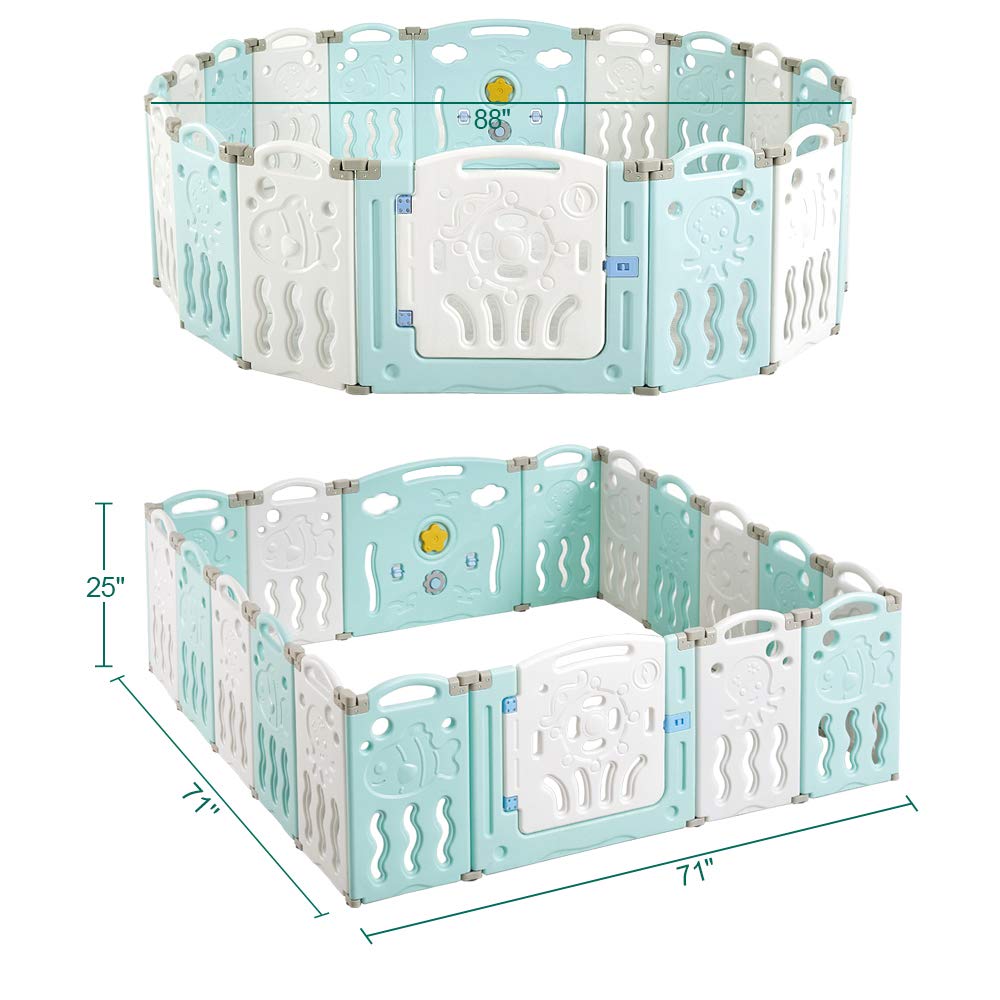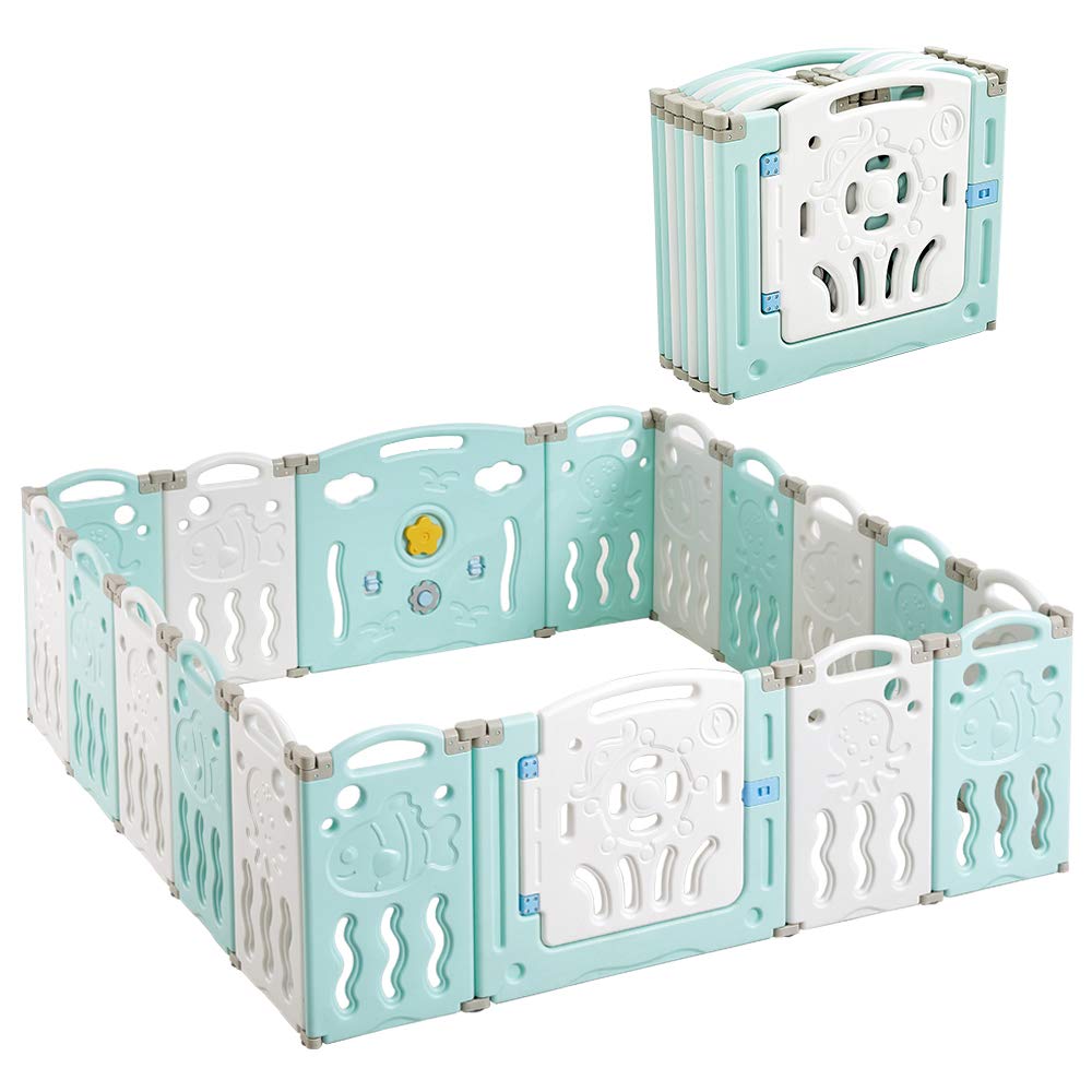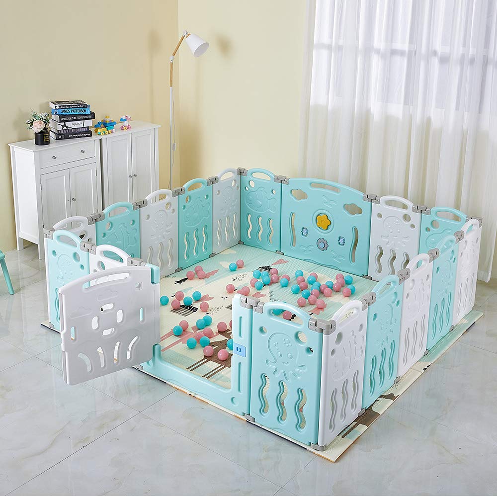 Baby Fence 18 Panels Kids Playpen- Foldable Toddler Safety Play Center Yard Adjustable Shape Portable Design for Children Toddler Indoor Outdoor Use Blue (16 Panels+1 Gate+1 Game Board) 19 Piece Set