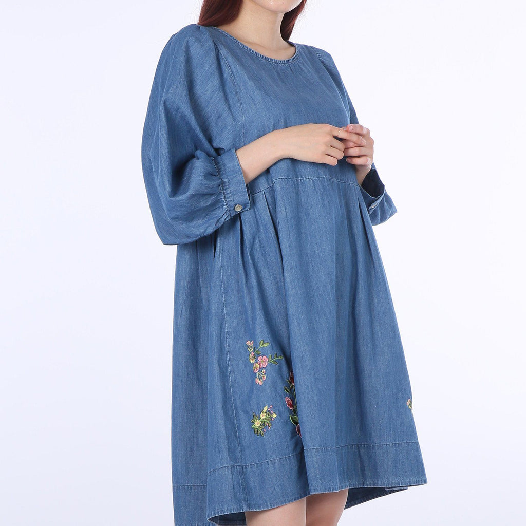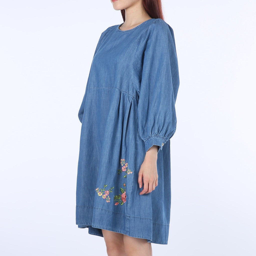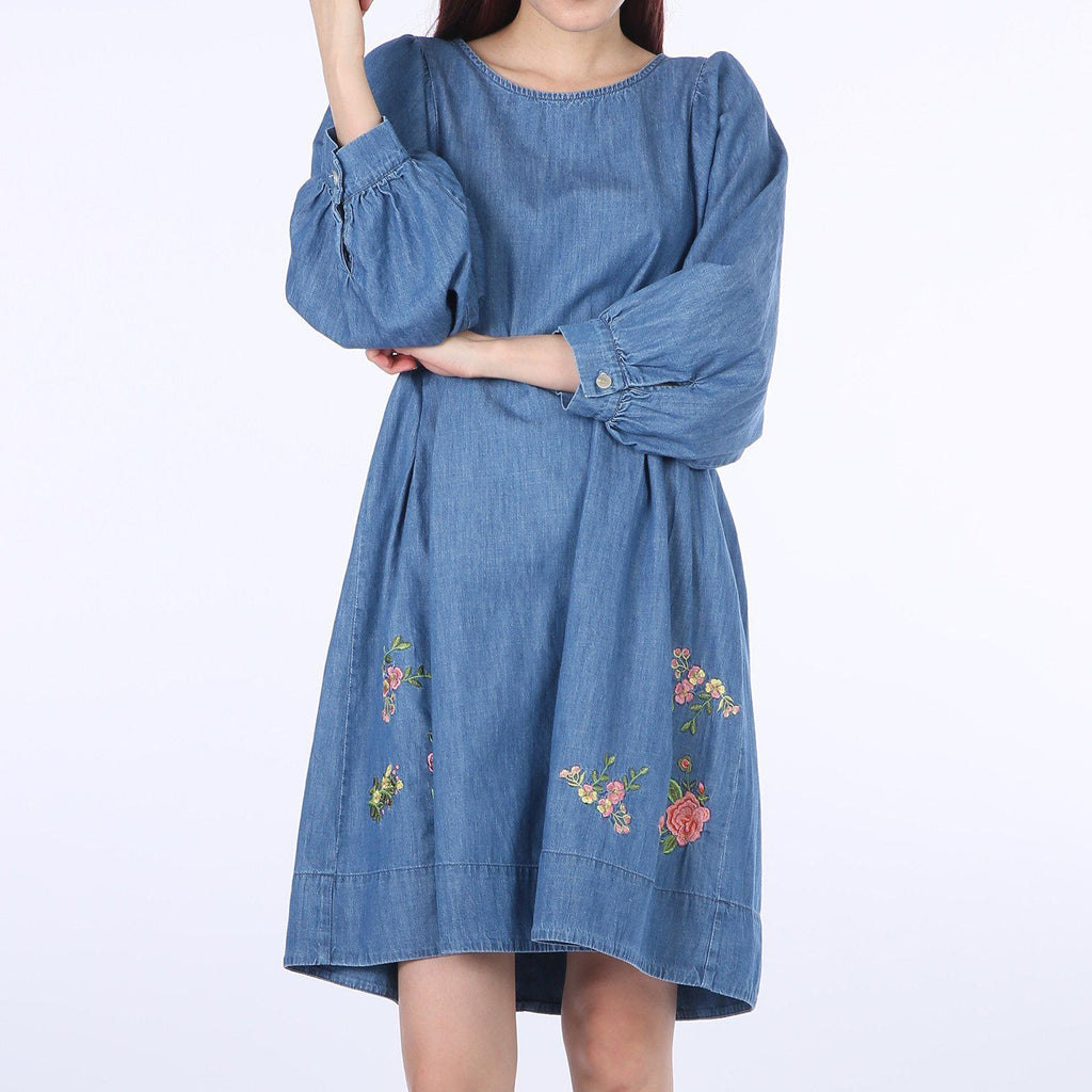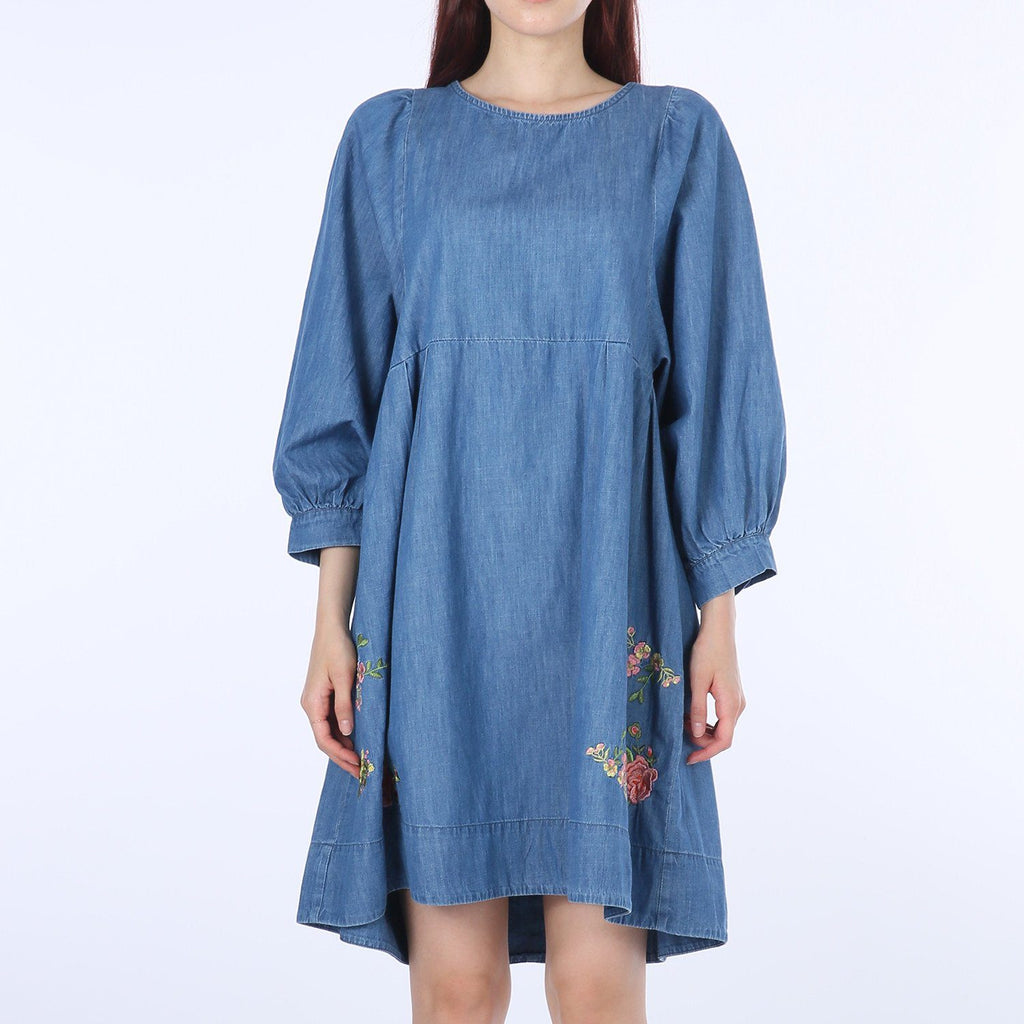 Flower-embroidery Balloon Denim One-piece