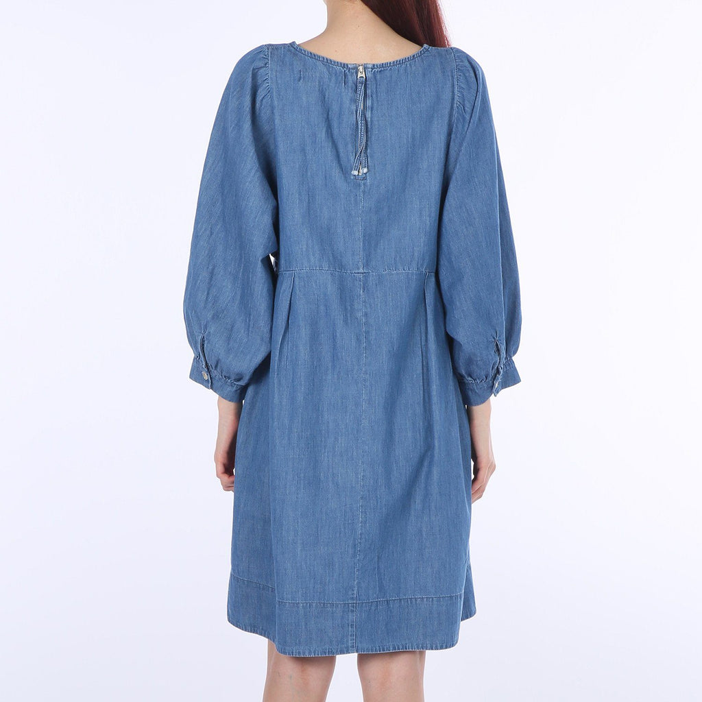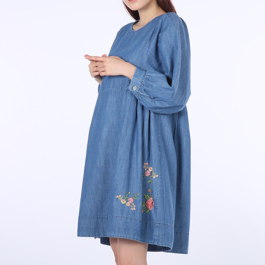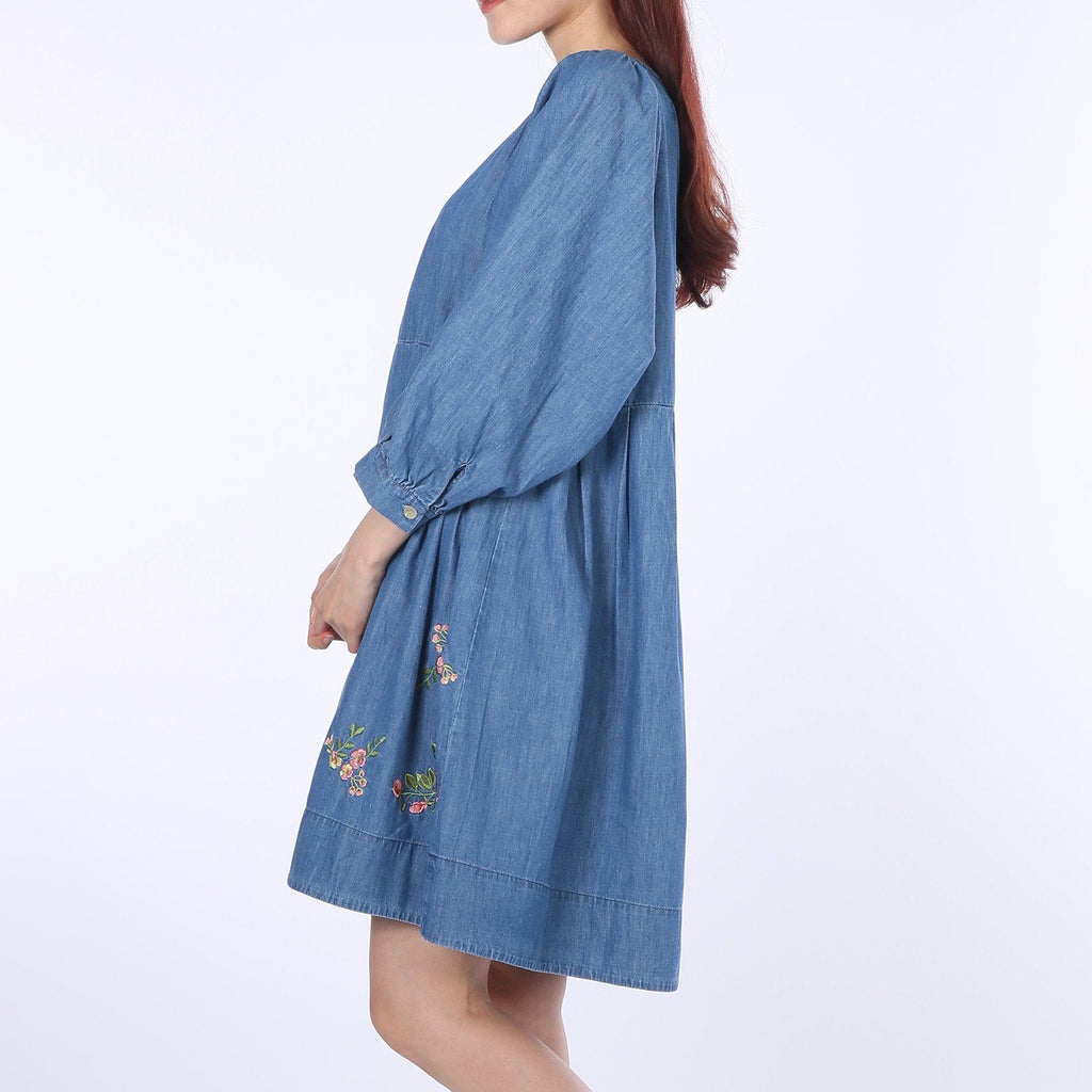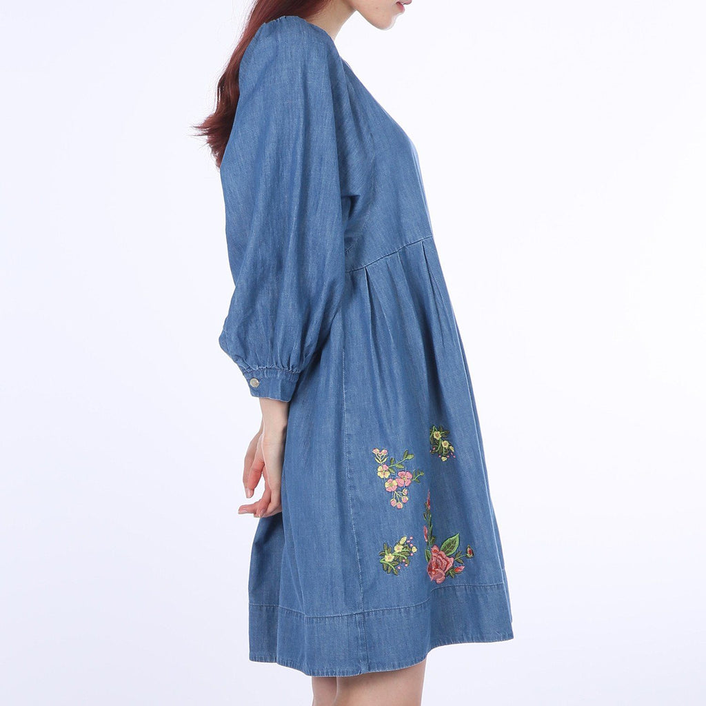 Flower-embroidery Balloon Denim One-piece