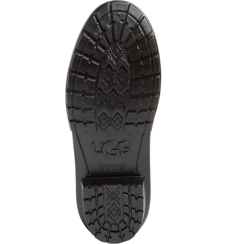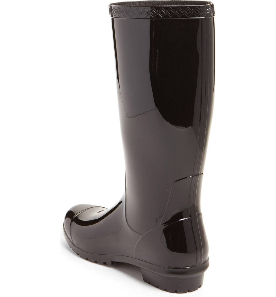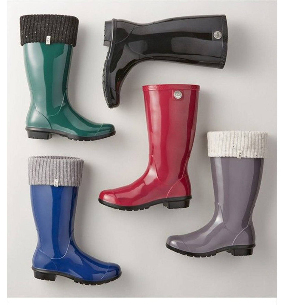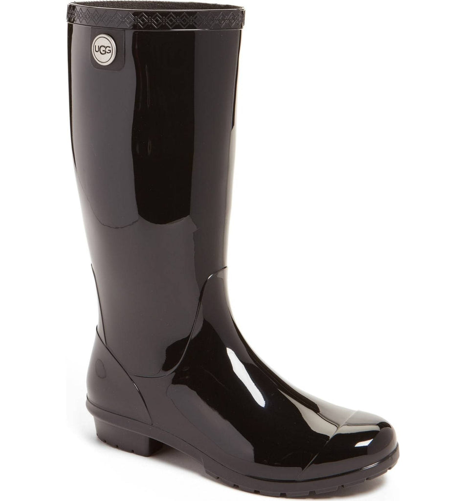 A glossy, waterproof rubber rain boot features a no-slip lug sole and a plush, cozy footbed cut from genuine shearling.